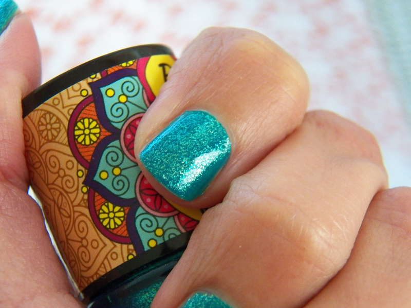 Die passende Farbe wäre gar nicht nötig gewesen - der Lack ist meiner bescheidenen Meinung nach phänomenal. Die Glitzerpartikelchen verteilen sich wie von selbst wunderbar gleichmäßig, sehr dicht und schimmern prima in Türkis mit einem leichten Goldton, den man auf meinen Bildern leider kaum sieht (blau schimmern sie allerdings nicht, das ist die Farbe vom transparenten Träger). Und was ich fast noch besser finde: Sie sind so klein und/oder dünn, dass die Oberfläche glatt bleibt. Kein Sandpapiergefühl.