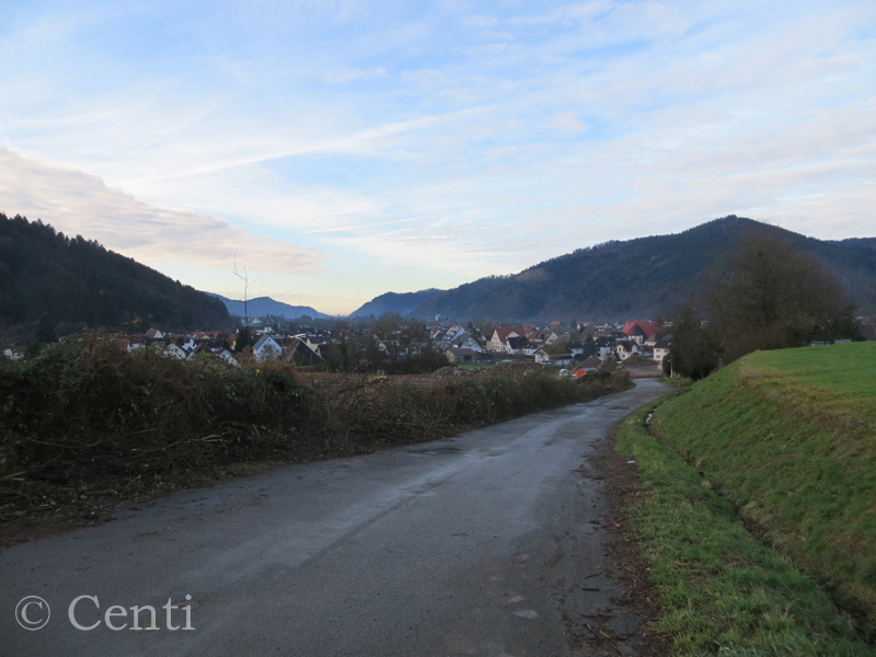 Das hier ist die Straße zwischen dem Friedhof in Bleibach und dem neuen Baugebiet linkerhand.